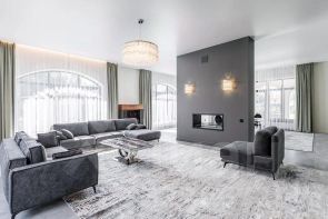 гостиная-столовая - 100 м2, камин, кухня, кинотеатр, бильярдная, мастер спальня с санузлом и гардеробной, 3 детских спальни, 2 санузла, кабинет, гостевая спальня, терраса, балкон.