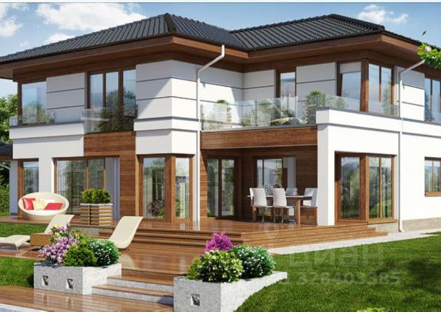 Дом из бруса, обложенный кирпичом, общей площадью 213,8 кв.м. Продуманная семейная панировка дома (есть разделение на общую часть и приватную) - на первом этаже расположены кухня, гостиная, санузел, на втором этаже: две спальни, гостиная и выходы на балкон, откуда открывается шикарный вид на весь участок. Третий этаж - отрытое пространство с удобной зоной хранения (сушки).
