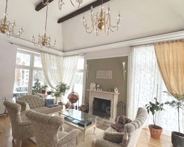 В доме: 5 спален с индивидуальными ванными комнатами и гардеробными, просторная кухня-гостиная с выходом на открытую веранду, кабинет/гостевая спальня с ванной комнатой, парадный холл с двумя гардеробными, 2 кладовые, котельная, теплый гараж на 2 м/м.