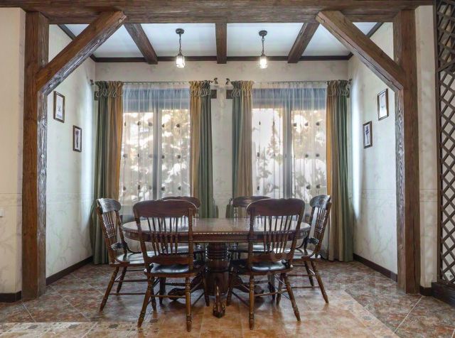 Комфортная внутренняя планировка дома, светлые интерьеры, удобная мебель, гостиная со светлым камином, просторная столовая с овальным столом, выполненным из дерева и интересными стульями с мягкой светлой обивкой, мраморная лестница с красивыми кованными перилами, зеркала в живописных рамах - все гармонично и привлекательно.