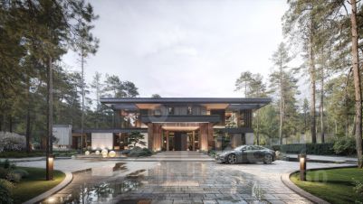 1 этаж: холл, прихожая, гардеробная, гараж - 2шт., спальня с гардеробной и санузлом, лифт, санузел - 3шт., гостиная, столовая, кухня, бассейн, сауна, душевая, серверная, терраса