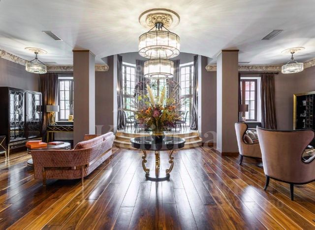 Входная группа открывает пространство первого этажа: две гардеробные с мебелью Porada и Frato, холл и объединённая зона гостиная - кухня - столовая с панорамными видами на участок. Гостиная со вторым светом и потолками почти 10 метров, камином и видом на парк. Центральная стена оформлена итальянским мрамором в раскладке "бабочка", создающей скульптурный эффект. В интерьере - диван Budapest и консоль Guell от Baxter, журнальный стол Minotti Song, аксессуары Bosa, предметы Ulivi и Smania. Обеденная зона - стол Minotti Linha на 12 персон, светильники HENGE и Terzani. Кухня - Siematic, с техникой GAGGENAU, оформлена лаконично и функционально. Также на этаже: кабинет с библиотекой (Emmemobili, Rugiano), гостевая спальня с ванной и гардеробной (Porada, Rugiano), две гостевые ванные комнаты и полноценный SPA-комплекс с бассейном, сауной, хаммамом и тропическим душем. Оконные системы SCHUCCO и двери RIMADESIO задают архитектурную точность, а стеклянный лифт добавляет драматургии пространству.