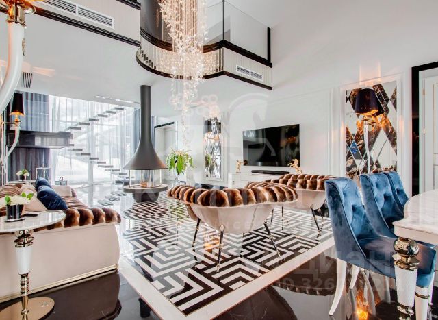 Интерьер построен на тёплой светлой палитре оттенков, что создаёт атмосферу уюта и простора; особую выразительность пространству придают зеркальные поверхности и натуральная деревянная фактура, гармонично вплетённые в общую концепцию дизайна.