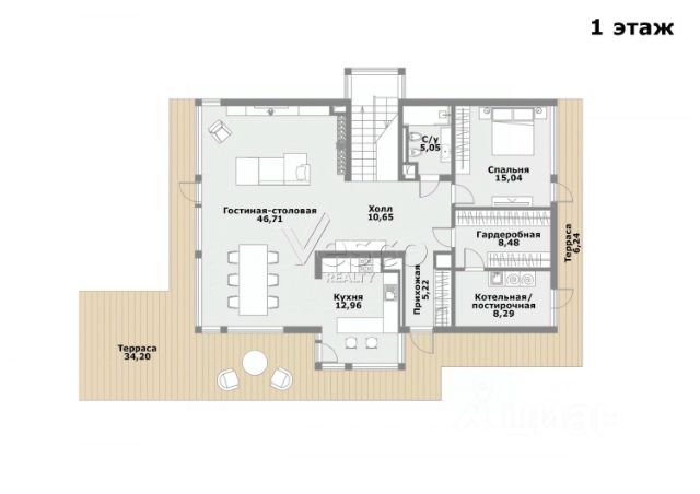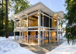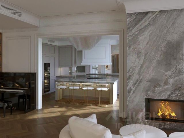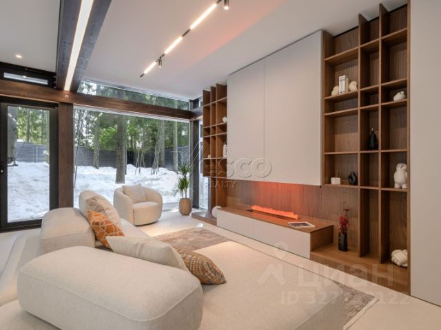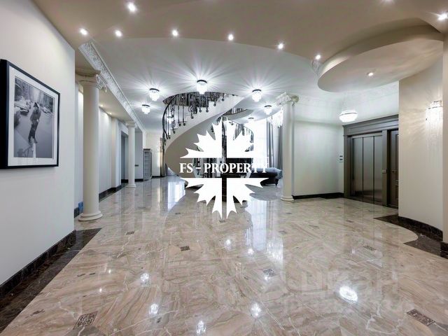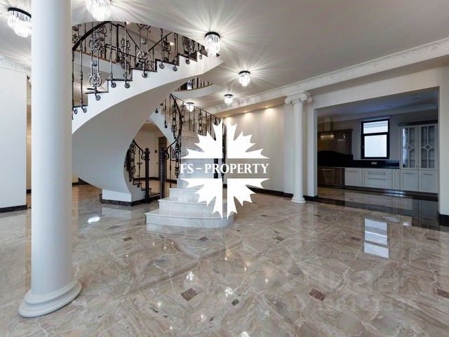 Из уютной гостиной (высота потолков более 6 м), выдержанной в светлых теплых тонах, можно попасть в столовую с панорамными окнами. В столовой имеется подогрев полов. В гостиной имеется действующий дровяной камин из розового мрамора. Полы из итальянского мрамора теплого песочного цвета с инкрустацией мрамором зеленого цвета. На первом этаже помимо гостиной 50,5 кв. м., столовой 19,34 кв.м., отдельной кухни 19 кв.м. располагается одна из спален 22 кв.м. с индивидуальной ванной комнатой, гостевой санузел, холлы. На втором этаже находятся еще 3 спальни. Из основной спальни 40,72 кв. м., имеющей индивидуальную ванную комнату, отделанную розовым мрамором с инкрустацией зеленым мрамором, есть выход на собственную террасу. Вид из всех окон и террас дома на зелень, в сад. Соседних домов не видно. Приватно и тихо. В цокольном этаже (с окнами) находятся сауна, бассейн, тренажерная, душевая, санузел, гардеробные, постирочная, комната для помощницы, бойлерная, гараж. Имеется мансарда свободного назначения.