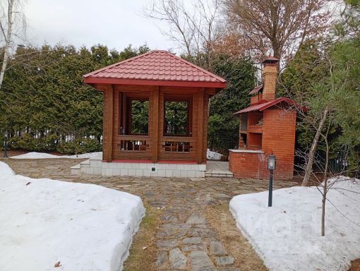На участке выполнен ландшафтный дизайн, установлены системы капельного и автополива, освещение, дорожки, дренажная система, беседка с электрическими розетками, освещением, водой, зона барбекю площадью 100 кв.м. Имеется большой набор мебели для сада из тика английской фирмы Глостэр (Gloster). По периметру участка высажены 300 туй Смарагд, на территории участка растут сирень, жасмин, рододендрон, хосты, лилейники, спирея, бонзайская сосна, можжевельники, клены, дуб, рябина, ели. Дом полностью готов к проживанию.