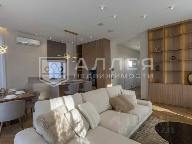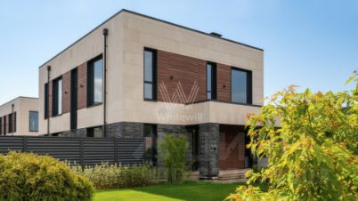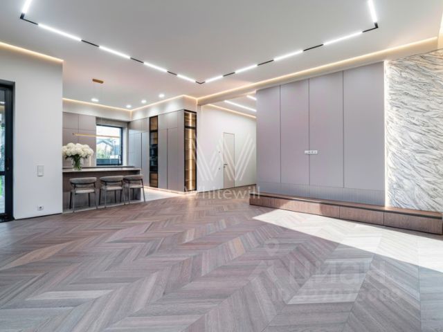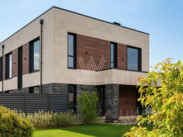 Корнер Лапино. Загородный коттедж площадью 372 м² расположен на полевом участке 8,3 сотки. Современный фасад облицован сланцем, натуральным камнем Limestone и панелями с фактурой дерева, а подсветка гармонично подчёркивает строгие формы здания в вечерние часы. Панорамное остелкение и потолки высотой 4 метра визуально расширяют пространство и создают ощущение свободы. Интерьеры выдержаны в светлых тонах, отделаны с использованием инженерной доски Vecchio, выложенной французской ёлочкой, итальянского и испанского керамогранита, а также укомплектованы встроенной авторской мебелью Rockwood, бытовой техникой Asko и сантехникой от европейских производителей. Для идеального микроклимата установлены мульти сплит-система Hisense и приточная вентиляция. Планировка включает просторную гостиную, объединённую с кухней-столовой с удобным островом, сауну из африканского дуба и термоосины с финской печью Helo Rondo 960, 4 уютные спальни, кабинет и вместительные гардеробные. Террасы общей площадью 97 м² станут излюбленными местами для отдыха на свежем воздухе. Оставить машины можно во встроенном двухместном гараже. Территория полностью огорожена и ухожена — здесь вас будет радовать аккуратный газон, обеспечивающий приятный вид из окна и гармонию с природой. Поэтажное описание • Первый уровень: прихожая, холл, гостиная-кухня-столовая, спальня, санузел с сауной, гардеробная, котельная, техническое помещение, гараж. • Второй уровень: холл, мастер-спальня с гардеробной, санузлом и балконом, 2 спальни, кабинет, санузел. Комментарий эксперта. Свяжитесь с брокером Whitewill, чтобы получить расширенную презентацию, больше фотографий или договориться о просмотре. Проведём экскурсию по локации и познакомим вас с этим объектом. ID 14 048.
