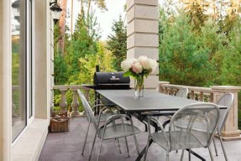 Фасад и интерьеры дома выдержаны в классическом стиле. Фасад отделан штукатуркой. Крыша - американская гибкая двухслойная черепица CertainTeed (установлена в 2022 году).