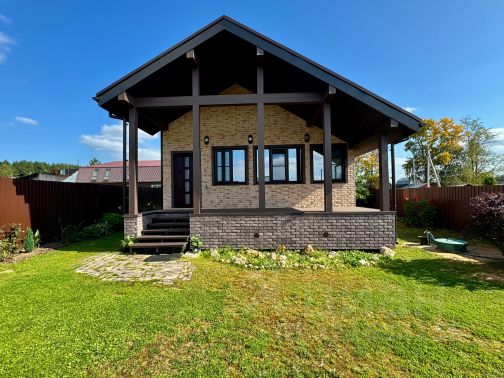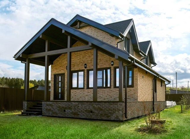 —внешняя отделка фасадной плиткой Каньон Конаковский (цоколь и фасады) с декоративными балками под кровлей; терраса — фиброцементным сайдингом Cedral Wood и террасной доской. Выполнена архитектурная подсветка фасадов.