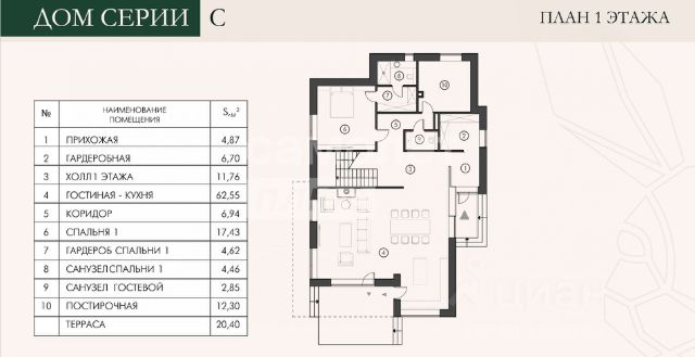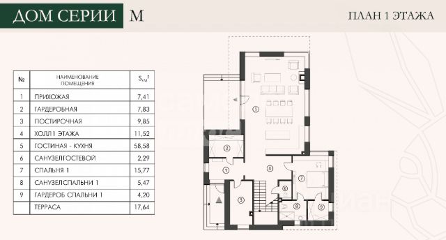 1 эт. прихожая, гардеробная, холл, кухня-столовая-гостиная с выходом на террасу, спальня с с/у и гардеробной, постирочная, с/у;