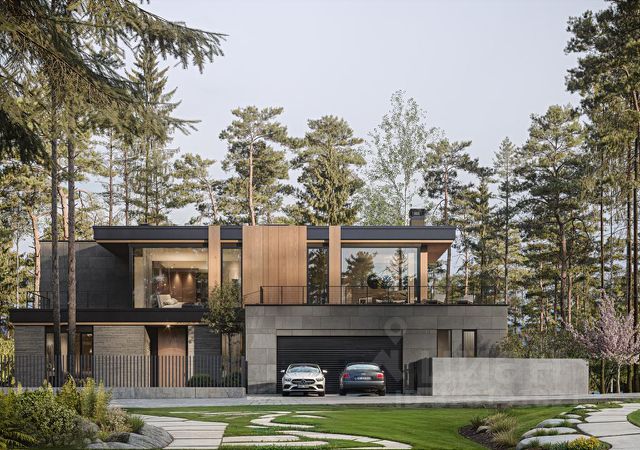 Рядом с основным зданием построены дом для персонала и гостевой дом площадью 840 м², в котором разместили банкетный зал, сцену, спортзал, бильярдную и 2 спальни с гардеробными. На просторной огороженной территории с лесными деревьями можно провести ландшафтные работы, засеять газон, высадить кустарники, выложить дорожки и оборудовать уличное освещение.