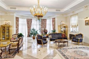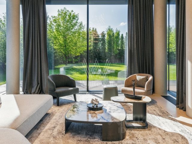 В доме: 4 спальни с ванными и гардеробными, гостиная-столовая, кухня, хобби-комната 50 кв.м, двухуровневая спа-зона с хаммамом, сауной и джакузи, гараж на 2 м/м с зарядкой для электроавтомобиля и помещением для водителя, котельная, отдельный блок персонала с профессиональной кухней в цоколе.