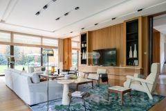 Парадная зона встречает высоким потолком, вторым светом и панорамными окнами с видом на парк. В центре гостиной - мраморное панно из итальянского камня, уложенное в раскладке "бабочка" - скульптурный акцент, задающий тон всему интерьеру, а также, не менее прекрасное украшение гостиной - акустический рояль SCHIMMEL. Мебель - Ulivi MAX и Minotti Horizonte, Baxter Calix, Minotti Song, Rugiano Decoro, аксессуары Bosa, Smania, Gallotti&Radice. Кухня объединена с обеденной зоной, дополнена барной стойкой и подвесами Gubi Multi-Lite. Также на этаже: кабинет с библиотекой (Emmemobili, Rugiano), гостевая спальня, парикмахерская, гардеробные, технические помещения, SPA-комплекс с бассейном, сауной, хаммамом, душевыми и раздевалками.