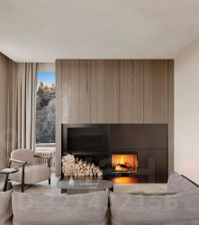 Приватная зона второго этажа организована вокруг двух лестничных холлов и включает две мастер-спальни. Один из мастер-блоков - двухуровневый, с отдельной лестницей, площадью 158 м, с кабинетом, ТВ-зоной, гардеробной и ванной с видом на лес. Второй - полноценный сьют с собственной гостиной и рабочей зоной (83 м).