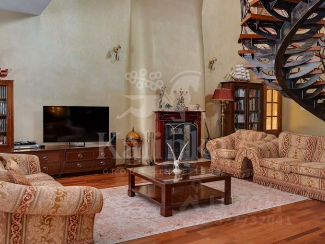 1-й этаж: На первом уровне расположены: Прихожая, гардеробная, просторная гостиная с камином, панорамным остеклением и выходом на террасу, столовая со столом на 10 персон, кухня с островом для завтраков и всем необходимым кухонным оборудованием, кабинет, гараж на 4 автомобиля.