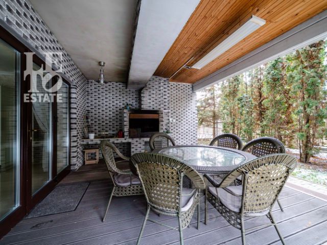 Ильинское ш., 20 км, д. Дубцы. Коттедж 460 кв. м "под ключ" в закрытом охраняемом коттеджном поселке Европа-1. Дом 2008 года постройки из кирпича с железобетонными перекрытиями. Тёплые полы, паркетная доска, уютное освещение помещений с разными сценариями, множество розеток. 3 этажа. Меблирован, оборудован бытовой техникой, полностью готов к проживанию. Цокольный этаж - гостевая спальня, с/у с душем, комната отдыха с джакузи, сауна, душевая, кладовая. 1 этаж: прихожая, кабинет, гардеробная, кухня - гостиная с выходом на просторную террасу, с/узел, гараж на 2 м/м, котельная (котел Buderus, бойлер, система водоочистки); 2 этаж: холл со встроенными шкафами, мастер спальня с с/у и гардеробной, 2 детские спальни со своими с/у; Коммуникации: газ магистральный, электричество, канализация центральная, вода центральная плюс собственная скважина. Котёл и бойлер Buderus. Водоподготовка. Кондиционеры. Участок 25 соток с ландшафтным дизайном. На участке дом для прислуги 75 кв. м, 2 этажный, из кирпича, 2 спальни; просторная беседка; детский спортивный городок;. дорожки брусчатка из гранита; автополив; пруд с мостиком; множество хвойных, декоративных и плодовых деревьев и кустарников; мини огород. Посёлок полностью заселен, камерный. Круглосуточная охрана, дежурство инженерных и др. служб. Действует регламент шумных работ. Очень низкая стоимость коммуналки. Видеонаблюдение. Брусчатые дороги, единый английский стиль, ландшафтный дизайн. Рядом Москва-река, сосновые леса, памятники архитектуры (Архангельское, храмы). Развитая инфраструктура: школы, детсады, поликлиники, бассейны, магазины, рестораны. Удобная транспортная доступность с Ильинского, Рублево-Успенского и Новорижского шоссе. Рядом автобусная остановка до м. Кунцевская или МЦД Павшино.