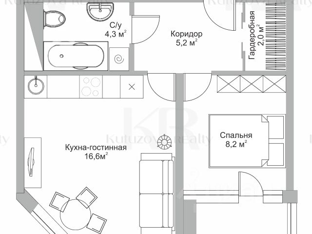 Общая площадь — 26,5 кв. м: при этом планировка продумана до мелочей, что бы максимально использовать пространство: мы смогли разместить спальную зону с полноценной кроватью, зону кухни-гостиной с комфортным, раскладным диваном и современной кухней со всей необходимой техникой (встраиваемый холодильник, духовка, свч, индукционная варочная панель, вытяжка, посудомоечная машинка). Зона спальни и кухни-гостиной разделяется бархатной портьерой. Из мест хранения: шкаф в прихожей, кровать с подъемным механизмом, тумба и шкафчик в с/у, нижние и верхние шкафы в кухонном гарнитуре, а так же есть возможность установить комод в комнате.
