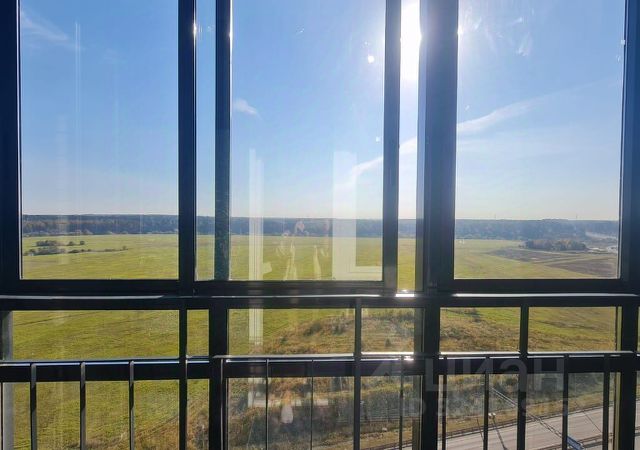 Вторая спальня размером 10,8 кв.м. Окно выходит на юго-восток, вид на поле за ЦКАДом. В комнате двуспальная кровать с подъемным механизмом, шкаф, тюль и шторы блэкаут.