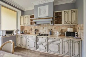 Оснащение кухни: холодильник, микроволновая печь, духовой шкаф посудомоечная машина, кофемашина, тостер, блендер, посуда, столовые приборы, чай, кофе, масло, соль, сахар