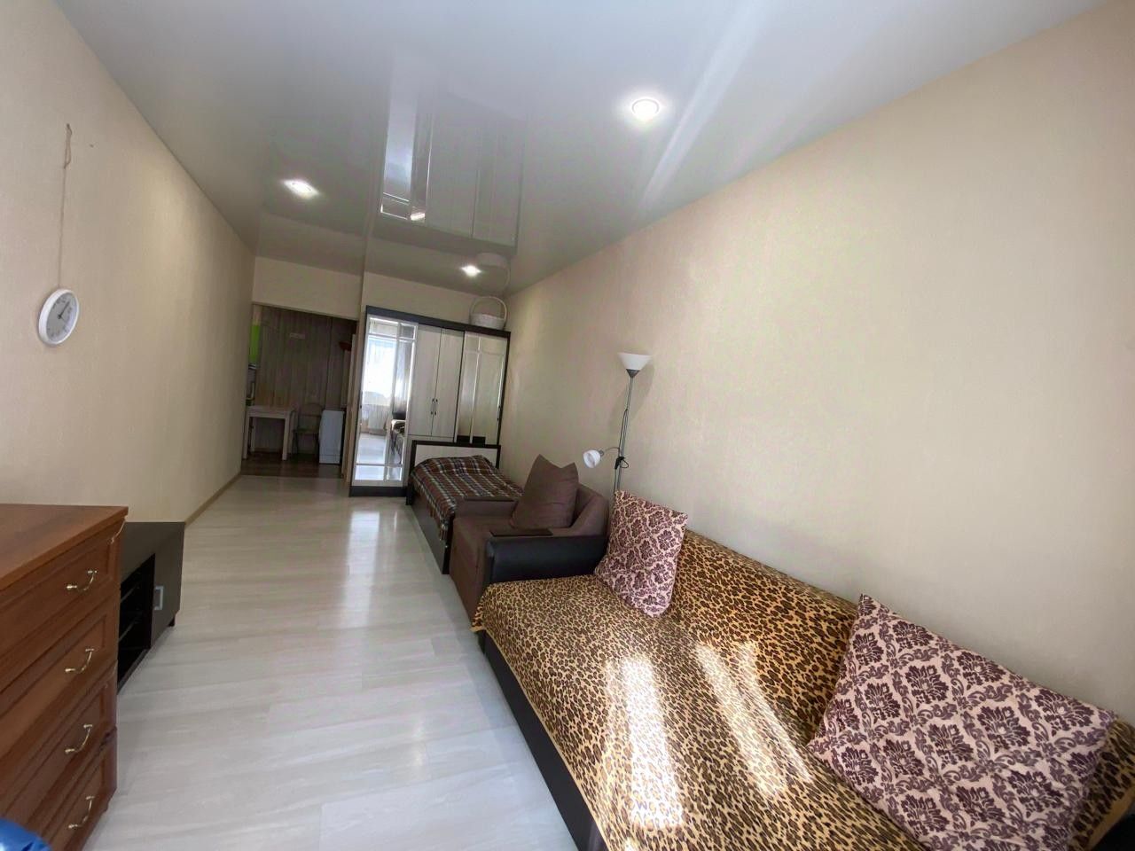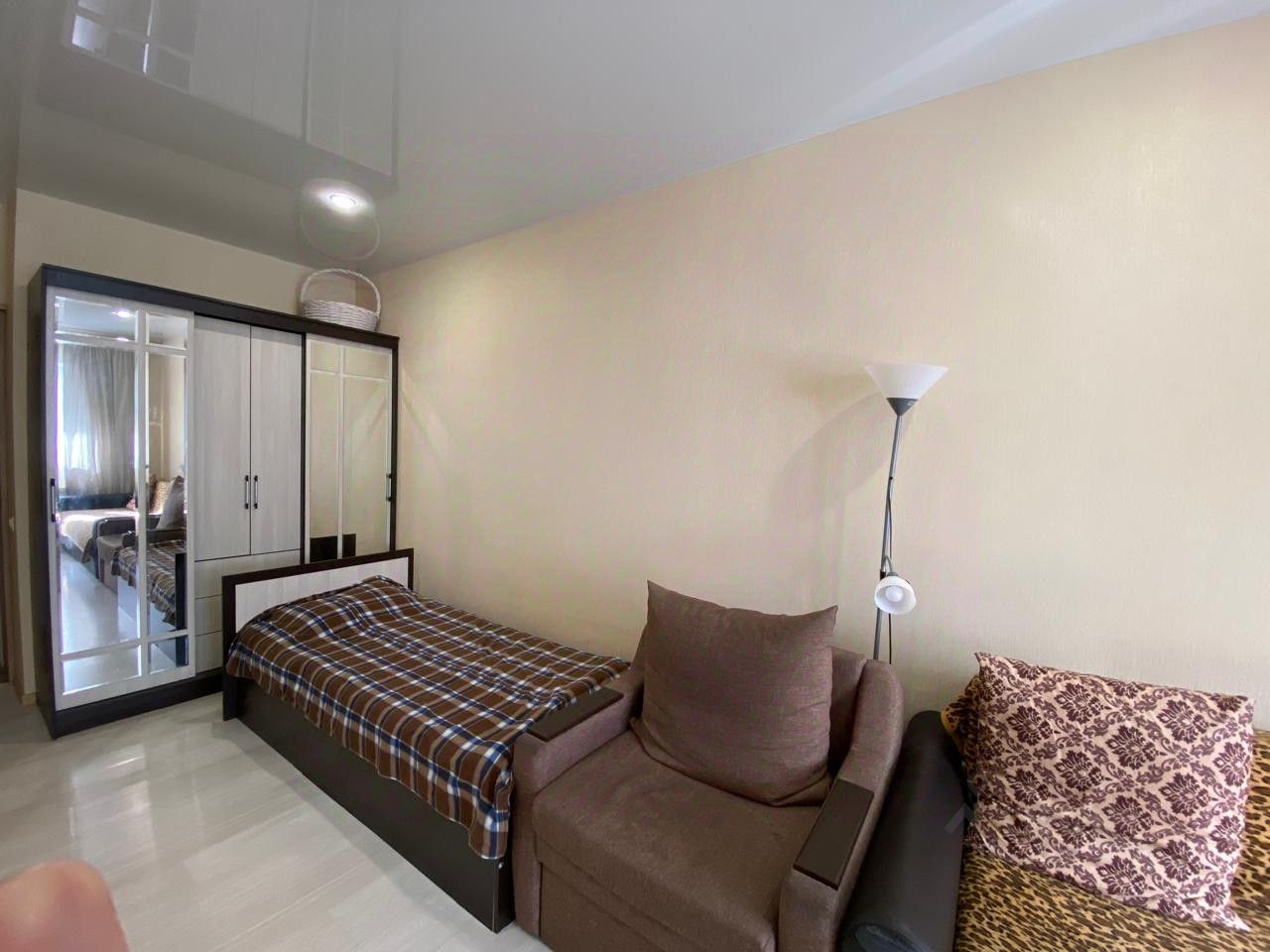 Светлая, теплая комната площадью 20 кв.м. В комнате есть три спальных места, диван и кресло раскладные. Есть шкаф для хранения вещей. Балкон застеклен. Окна выходят во двор, шума от дороги не слышно.