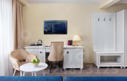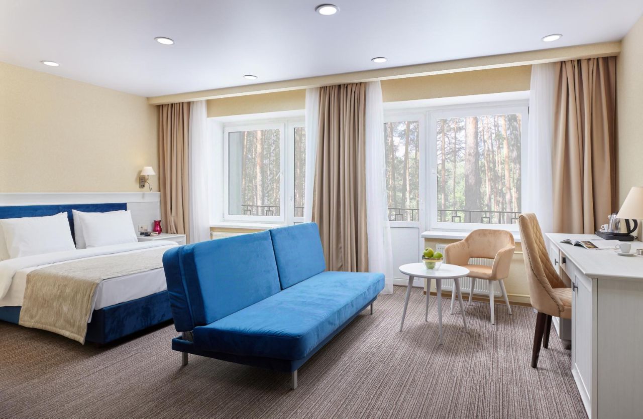 Новые номера! Номера повышенной комфортности Junior Suite расположены в отдельно стоящем корпусе, номера площадью 30 кв.м. для комфортного размещения 2-4 человек. В номере расположена двуспальная кровать. Возможна установка детской кроватки. В номере также расположен раскладной диван. Дети до 8 лет на дополнительном месте проживают бесплатно (не более 2 детей в номере) , не превышая максимально допустимое количество человек в номере.