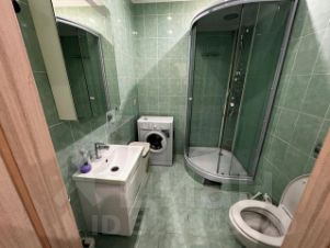 Совмещенный санузел с душевой кабиной и стиральной машиной.