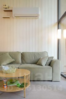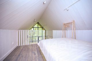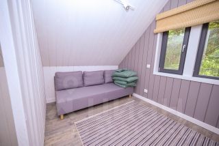 Комната на втором этаже с раскладывающимся диваном и огромным креслом-мешком.