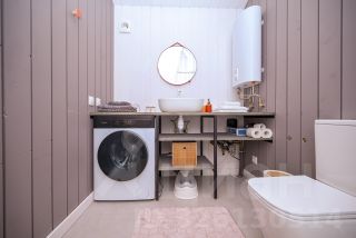 • Стильная ванная комната с душевой, стиральной машиной и местом для хранения.