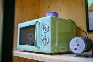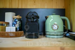 Компактная кухня со всем необходимым: капсульная кофемашина, плитка, компактный холодильник, чайник, микроволновая печь,