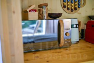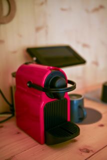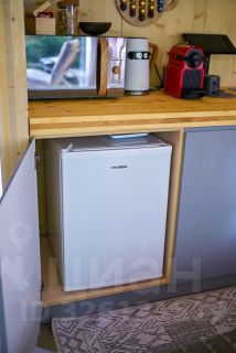 Компактная кухня со всем необходимым: капсульная кофемашина, плитка, компактный холодильник, чайник, микроволновая печь.