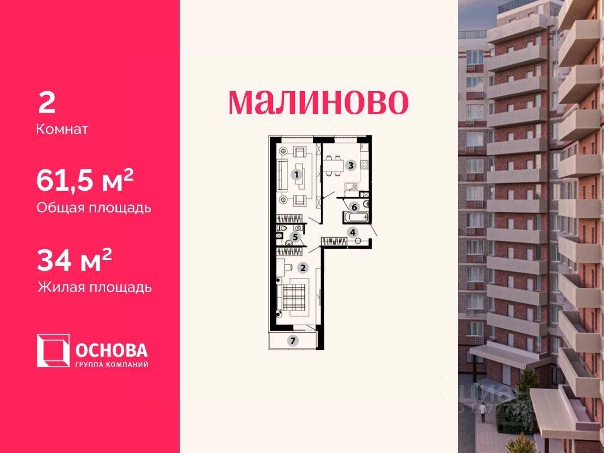Продается 2-комн. кв-ра площадью 61,5 кв.м на 4 этаже 12 этажного монолитно-кирпичного дома в ЖК "Малиново".