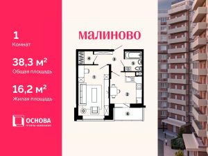 Продается 1-комн. кв-ра площадью 38,3 кв.м на 1 этаже 12 этажного монолитно-кирпичного дома в ЖК "Малиново".