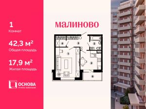 Продается 1-комн. кв-ра площадью 42,3 кв.м на 1 этаже 12 этажного монолитно-кирпичного дома в ЖК "Малиново".