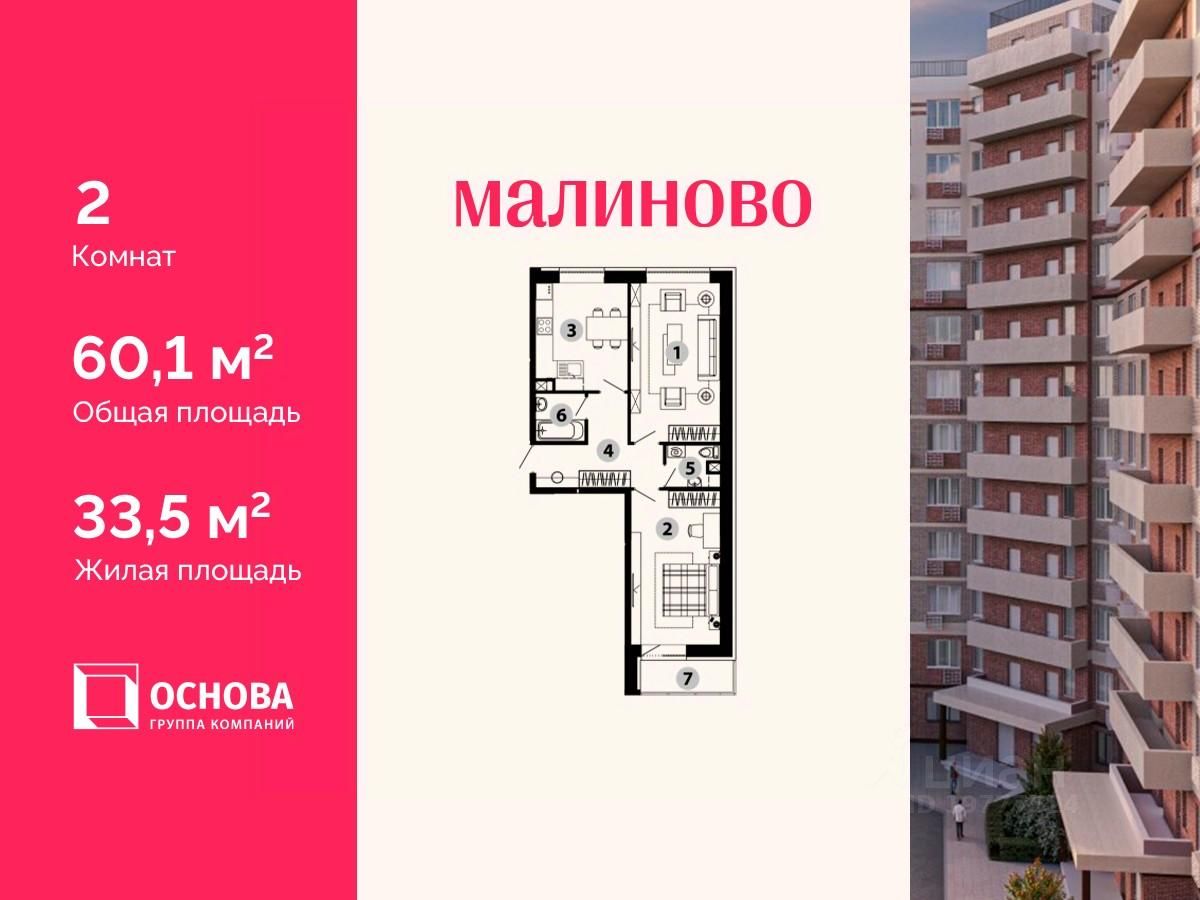 Продается 2-комн. кв-ра площадью 60,1 кв.м на 10 этаже 12 этажного монолитно-кирпичного дома в ЖК "Малиново".