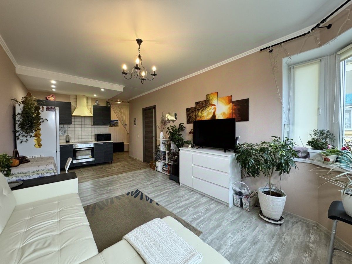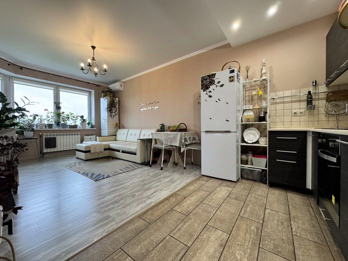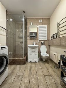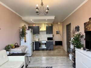 Просторная кухня-гостиная, спальня с гардеробной, ванная в плитке с душевой кабиной.