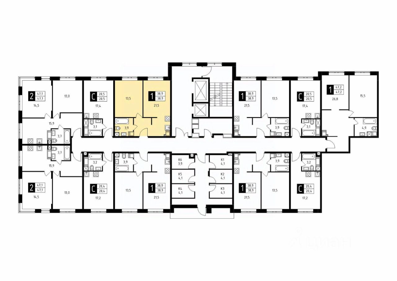Продаётся 1-комнатная квартира в строящемся доме (Корпус 6), срок сдачи: 2-кв. 2026, общей площадью 38.90 кв.м., на 16 этаже.