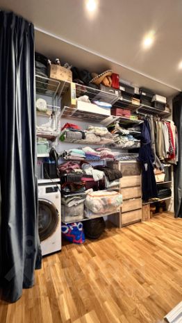 В квартире много мест для хранения вещей: шкаф для верхней одежды Икеа, гардеробная система Ларвидж, стеллаж по индивидуальному заказу с вместительными ящиками