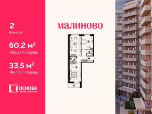 Продается 2-комн. кв-ра площадью 60,2 кв.м на 3 этаже 12 этажного монолитно-кирпичного дома в ЖК "Малиново".
