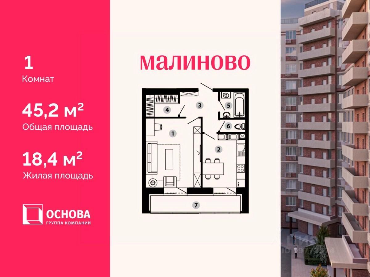 Продается 1-комн. кв-ра площадью 45,2 кв.м на 5 этаже 12 этажного монолитно-кирпичного дома в ЖК "Малиново".