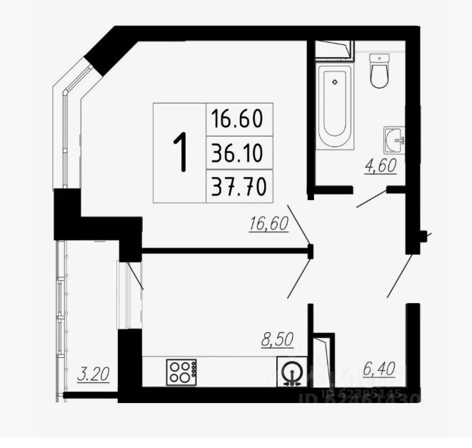 Арт. 130090320 Предлагается однокомнатная квартира площадью 37,2 кв.м. по ЕГРН + застекленная лоджия, без отделки. Окна выходят на солнечную сторону, функциональная планировка предусматривает кухню 9 кв.м., комнату 20 кв.м., гардеробную, просторный санузел, холл.