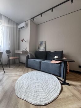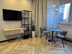 Реализована удобная планировка, которая включает в себя кухню-гостиную и спальню, большую гардеробную систему с постирочной при входе, а также большую ванную комнату. На кухне установлена вся необходимая техника для комфортной жизни ( встроенный холодильник, полноразмерная посудомоечная машина, полноразмерный духовой шкаф и современная индукционная варочная панель, а также угольная вытяжка. Установлен мощный кондиционер). Диван в кухне-гостиной раскладнои.