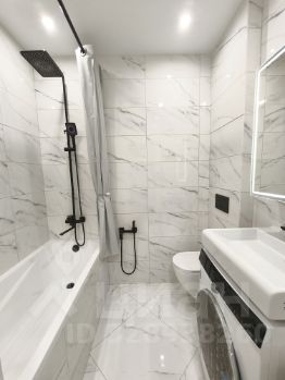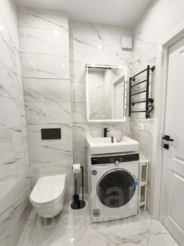 **Санузел** 3,2м² — ванна *Am-Pm*, стиральная машина с функцией отпаривания, гигиенический и тропический душ, инсталляция Oli;