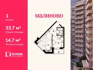 Продается 1-комн. кв-ра площадью 33,7 кв.м на 9 этаже 12 этажного монолитно-кирпичного дома в ЖК "Малиново".
