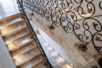 Дом построен из кирпича, в отделке использованы натуральные материалы, такие как травертин, дерево благородных пород, розовый мрамор, стены покрыты венецианской штукатуркой. Кухня оборудована бытовой техникой Bosch, Kuppersberg, Miele, Liebherr.