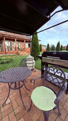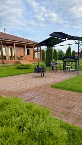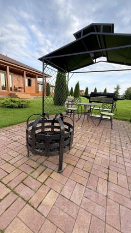Есть зона барбекю с навесом, мангалом, тандыром, костровой чашей и столиком со стульями.