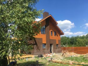 Дом двухэтажный, в классическом стиле, построен в камне с элементами деревянной отделки. Фундамент - монолитная плита, стены из пескоцементного заводского блока с утеплителем, фасад отделан лицевым кирпичом. Перекрытие - ж/б монолитная плита, лестница -ж/б монолитная, утепленная кровля покрыта металлочерепицей, теплые пластиковые окна. Есть возможность установки камина.