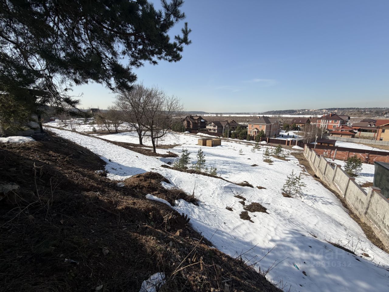Участок расположен на возвышенности в глубине жилого поселка, что обеспечивает тишину, приватность и открытый панорамный вид.