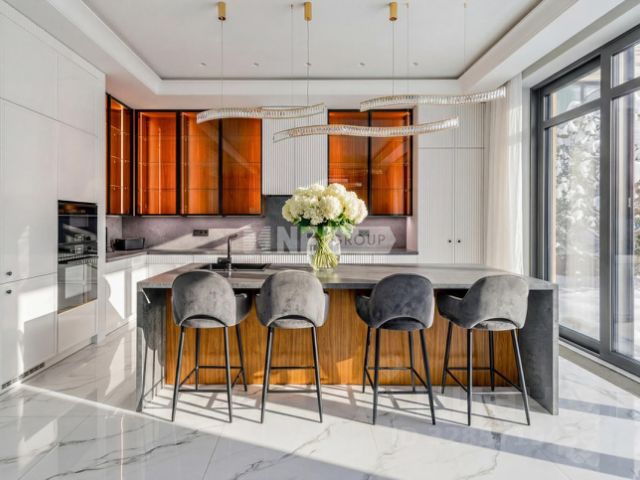 Комфортная планировка, эксклюзивная дизайнерская отделка, светлые интерьеры, дорогая мебель, богатые люстры, дизайнерский, большой камин.